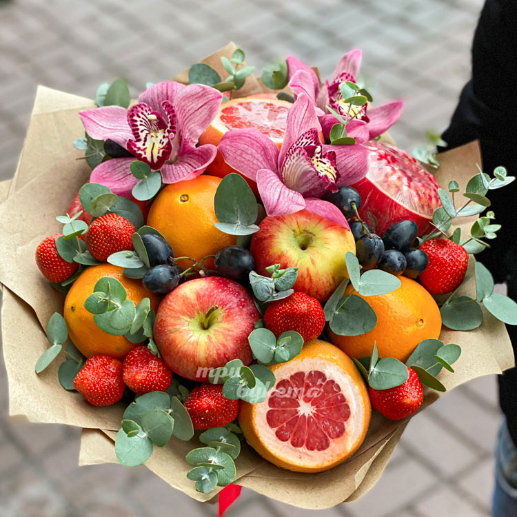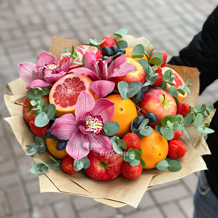 Букет из фруктов и клубники с орхидеями