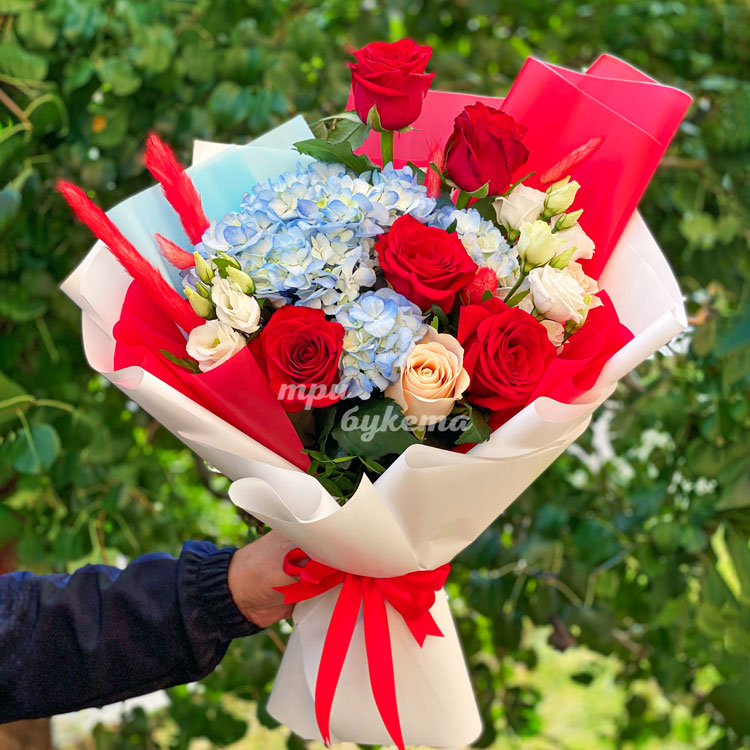 Букет красных роз и синей гортензии