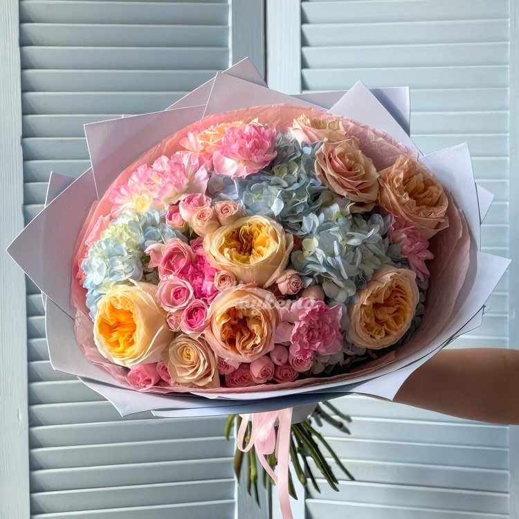 Букет ярких роз, гвоздик и гортензий