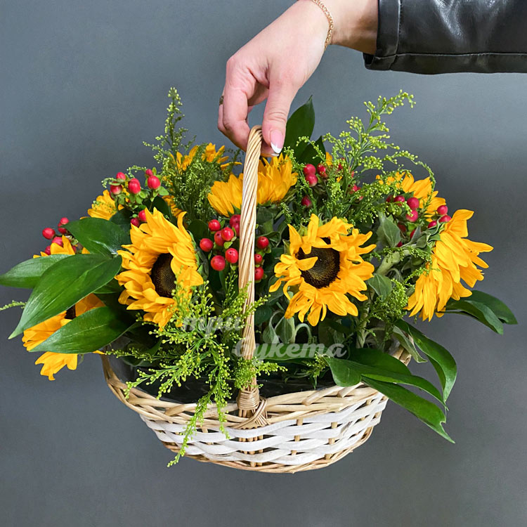 Корзинка с подсолнухами и зеленью
