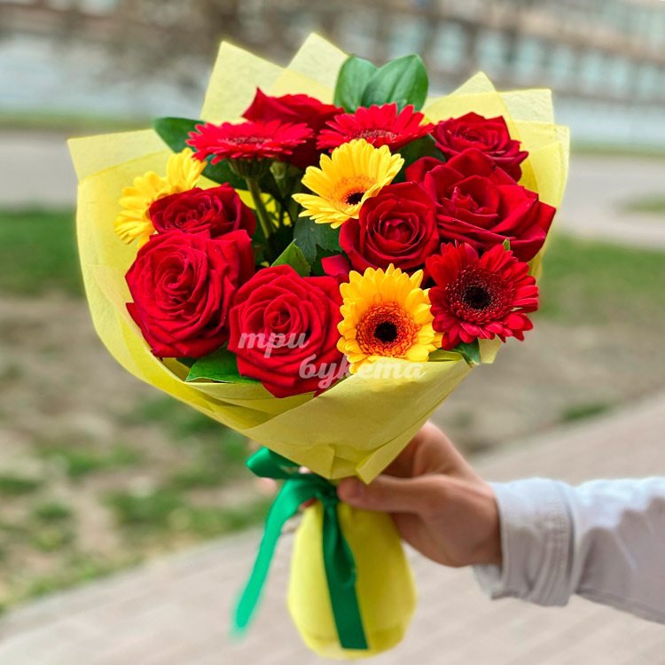 Красно-желтый букет гербер и роз