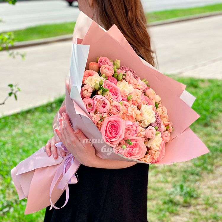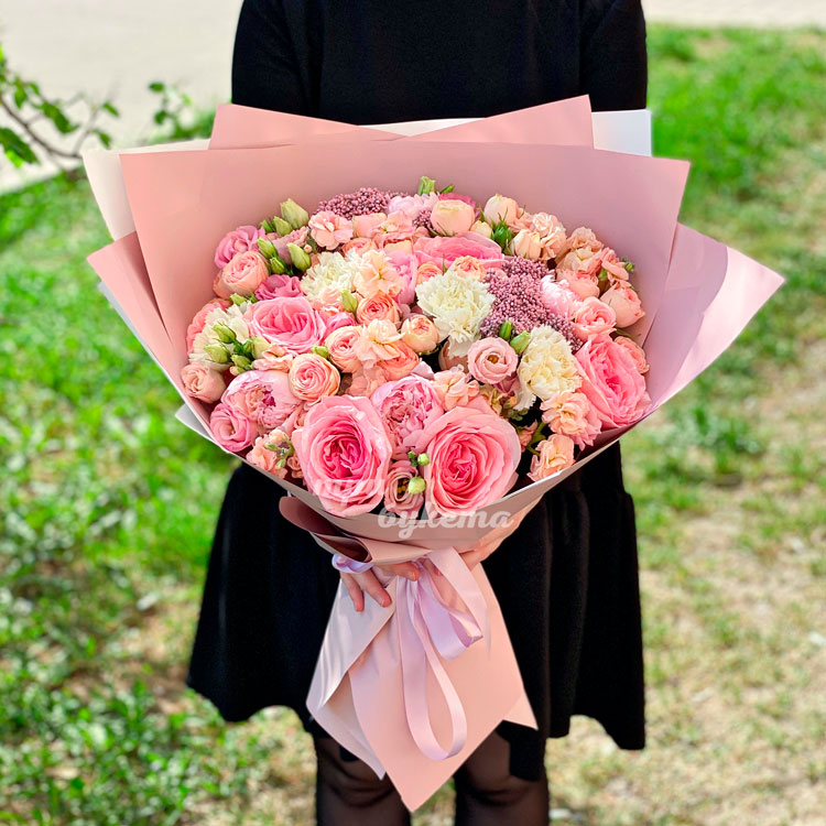 Розовый букет из пионов, роз и маттиол