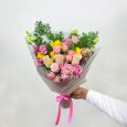 Розовый букет кустовых роз и гипсофилы