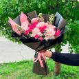 Розовый букет пионовидных роз с эвкалиптом