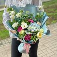 Яркие эустомы, гвоздики и розы в букете