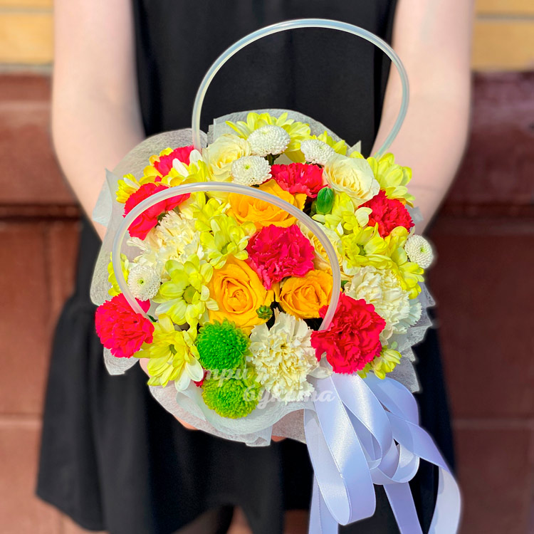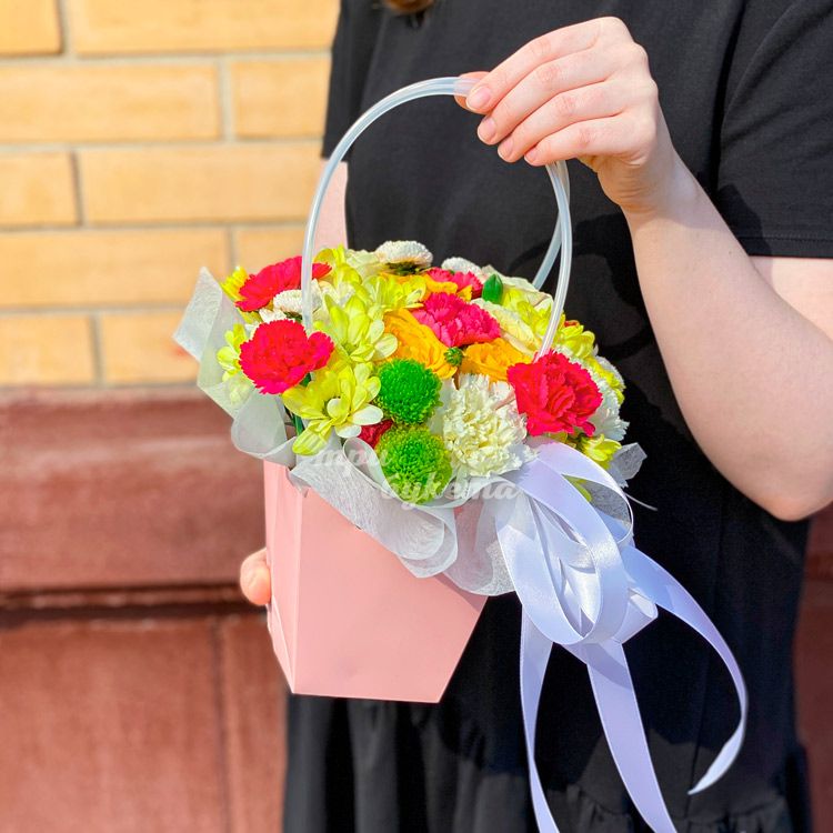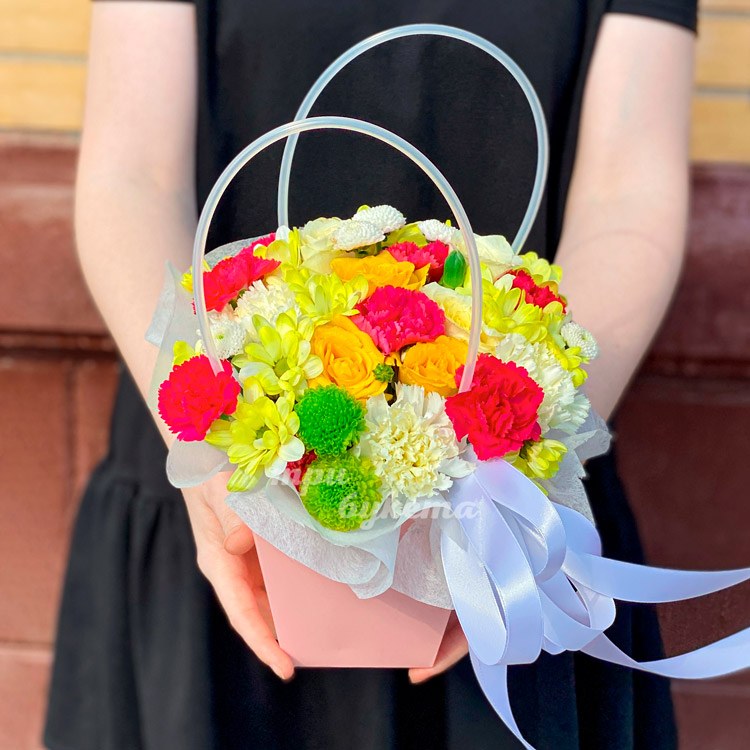 Яркие гвоздики и хризантемы в коробке