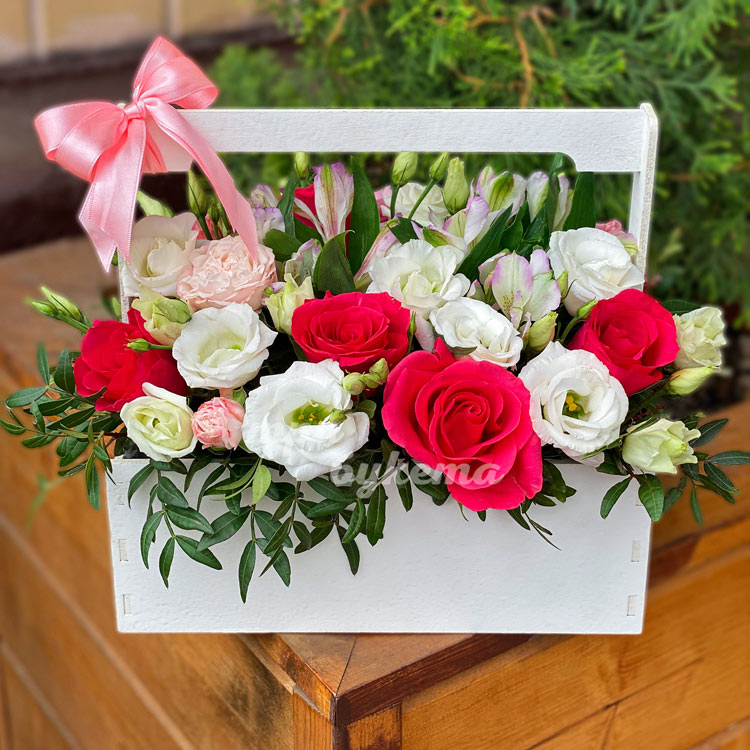 Ящик белых эустом и красных роз